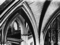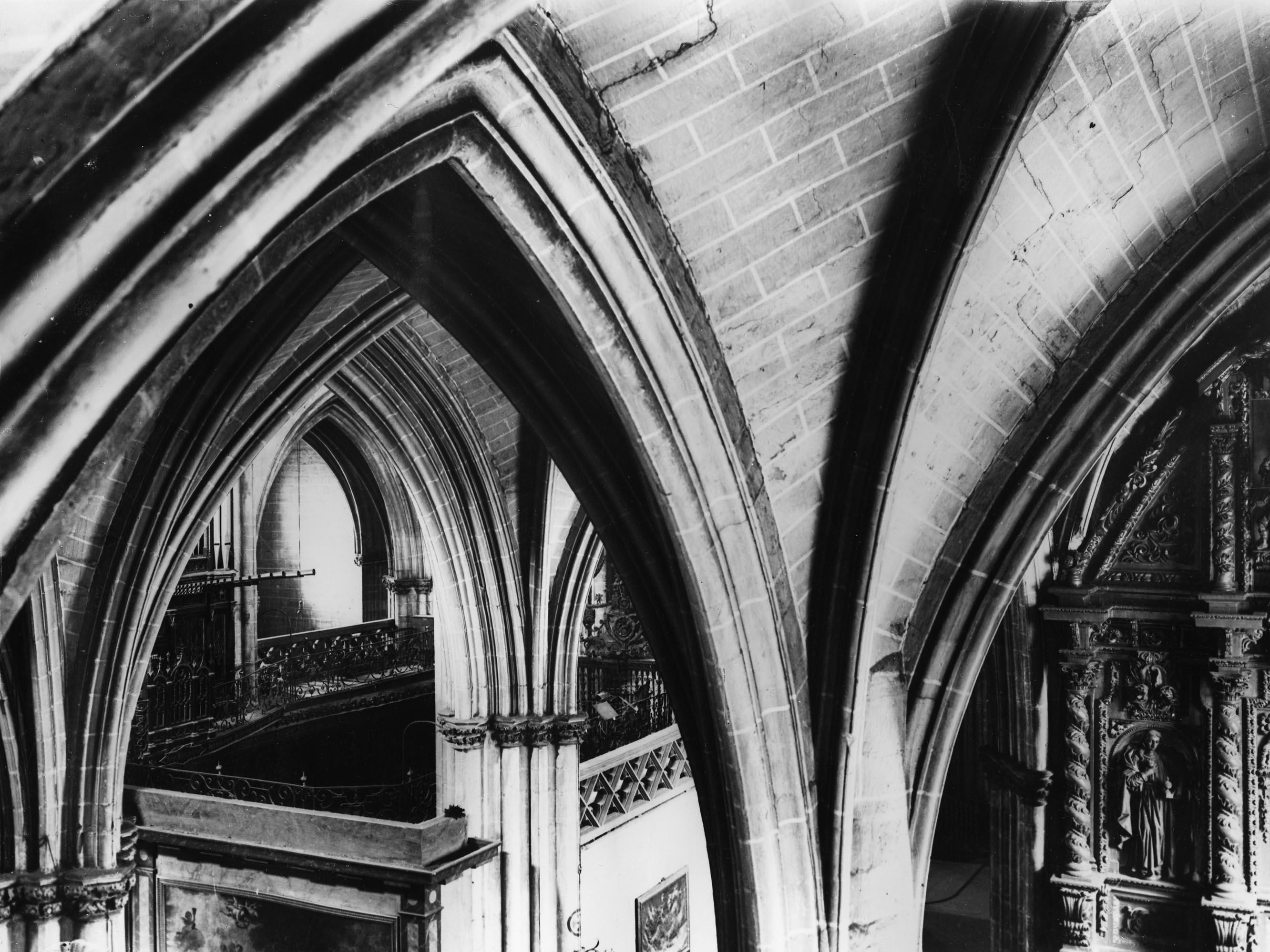Vista parcial interior de las bóvedas del cuerpo de naves de la iglesia catedral de Santa María la Real de Pamplona, tomada desde la capilla de Santa Catalina hacia el noreste. En primer término, bóvedas de crucería de la capilla. Tras ellos, pilar, nervios y plementos de bóvedas de la nave sur. Más atrás, la nave central cerrada por el altar del trascoro y la sillería de coro, a los pies de un órgano. Al fondo, la nave norte y sus capillas anexas.