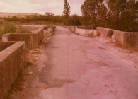 Vista general de la calzada del puente sobre el río Arga en Larraga, tomada desde la parte central hacia el noroeste durante la ejecución de trabajos para ampliación de la calzada. En el centro, calzada asfaltada de la carretera Estella - Tafalla (actual NA-132) a su paso sobre el puente, protegida por pretiles de piedra y ladrillo, en construcción. Al fondo, carretera sobre la margen derecha, en el paraje del Palenque.
