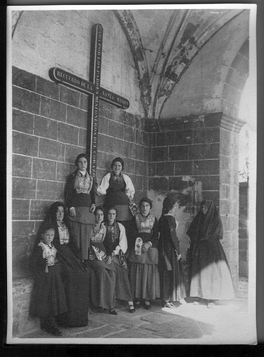 Retrato colectivo de un grupo de mujeres roncalesas vestidas con indumentaria tradicional del valle de Roncal, tomado en el pórtico de la iglesia de San Esteban en la localidad de Roncal. En el centro, 8 mujeres y una niña.
