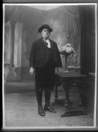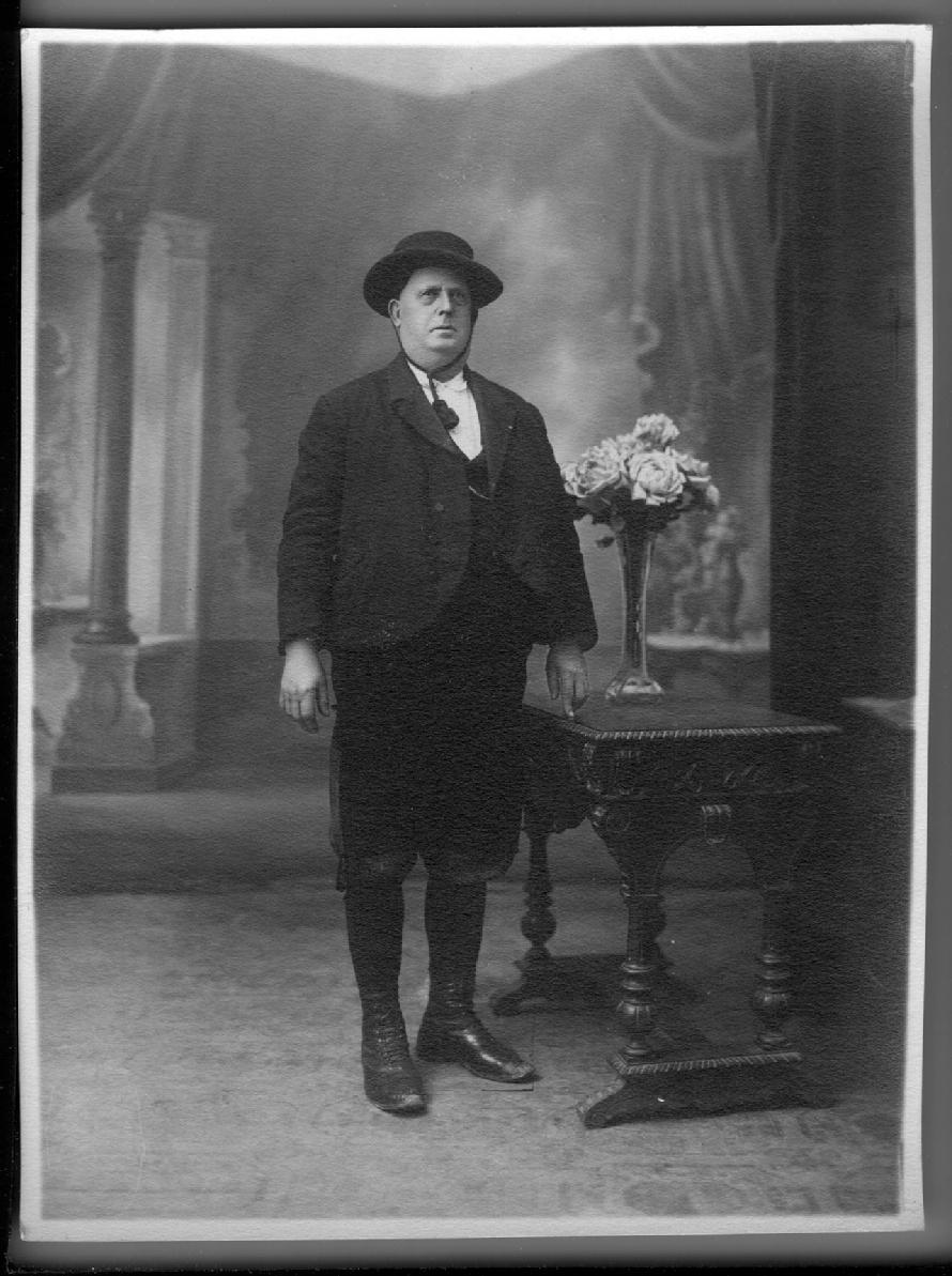 Retrato de estudio en plano entero de un hombre en pie vestido con el traje tradicional de los hombres casados en el valle de Roncal.