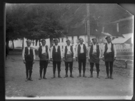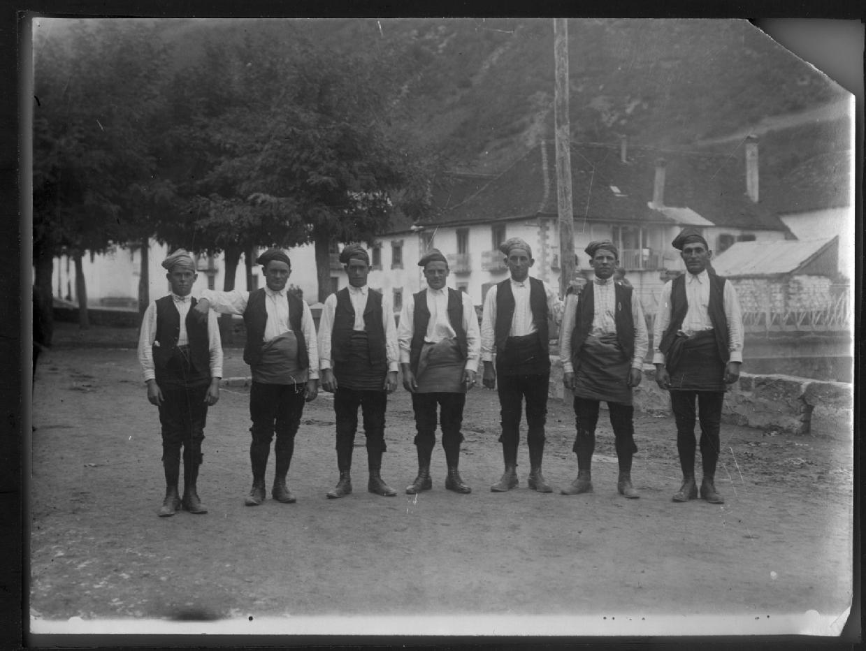 Retrato colectivo de un grupo de hombres jóvenes salacencos vestidos con la indumentaria tradicional del valle de Salazar, tomado en el barrio Iribarren de Ochagavía. En primer término, el grupo de mozos integrado por 7 hombres. Al fondo, casas del barrio Urrutia.