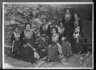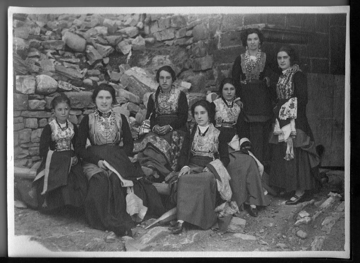 Retrato colectivo de un grupo de muchachas vestidas con el traje tradicional de las mujeres solteras en el valle de Roncal, tomado ante la casa López en la localidad de Roncal.