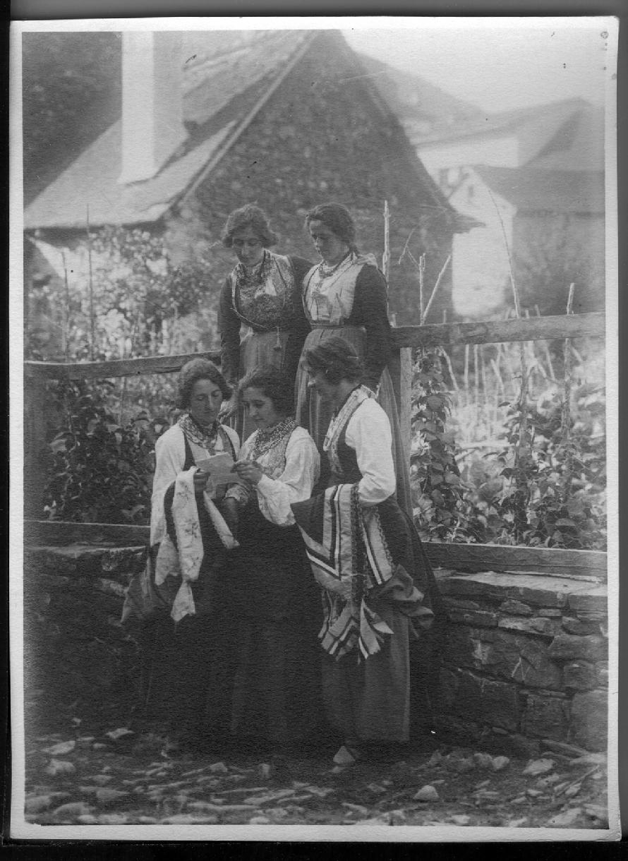Retrato colectivo a modo de escena con un grupo de muchachas vestidas con el traje tradicional de las mujeres solteras en el valle de Roncal. En el centro, una joven en pie lee una carta rodeada por otras 4 muchachas, ante un huerto.