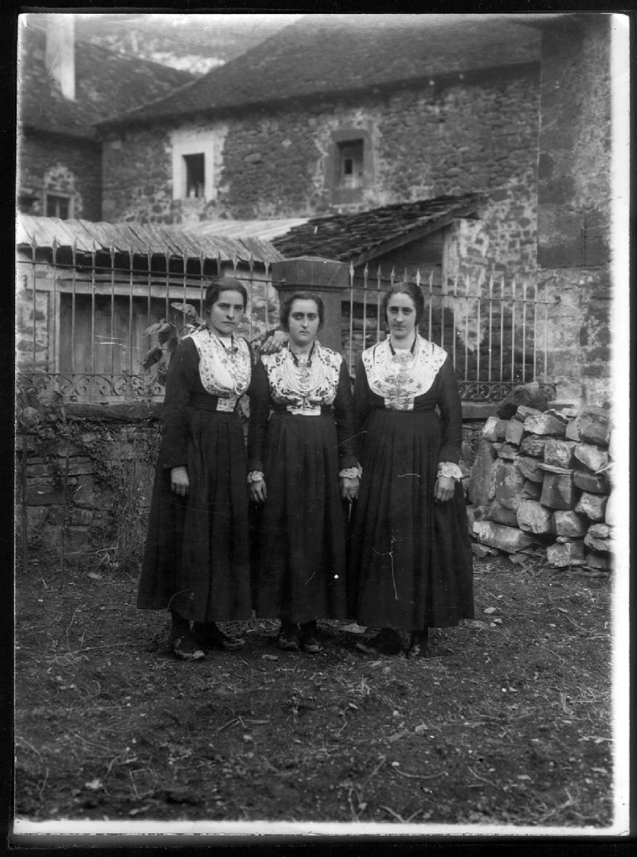 Retrato colectivo de un grupo de tres mujeres salacencas vestidas con la indumentaria tradicional de las muchachas del valle de Salazar, tomado en Ochagavía.