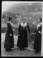Retrato en plano entero de 3 mujeres salacencas vestidas con el traje de gala tradicional de las muchachas del valle de Salazar, tomado en Ochagavía.