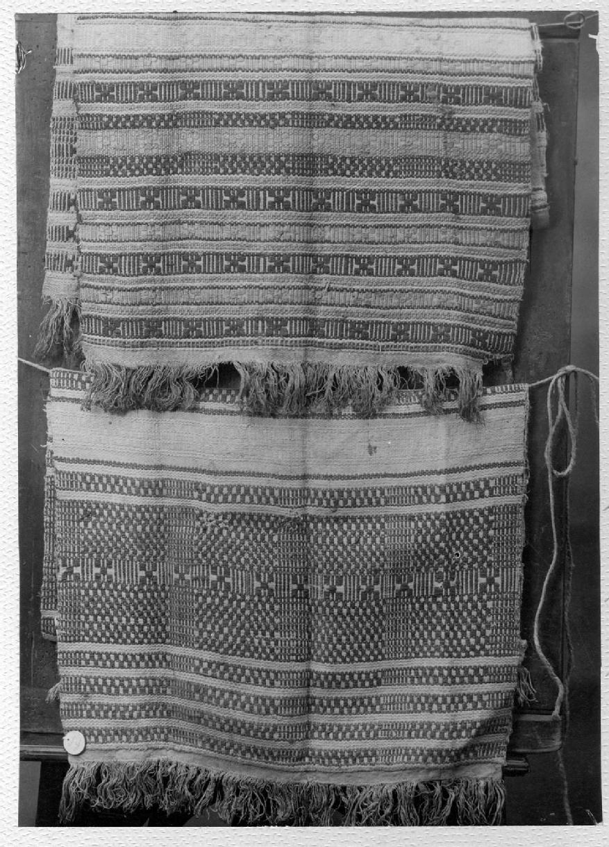 Vista general de dos piezas textiles tradicionales, toallas o tapetes, decoradas con grecas bordadas en punto de cruz y elaboradas en Urdiáin, en el valle de la Burunda.