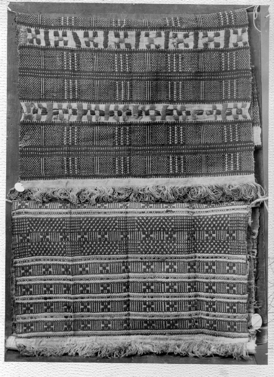 Vista general de dos piezas textiles tradicionales, toallas o tapetes, decoradas con grecas bordadas en punto de cruz y elaboradas en Urdiáin, en el valle de la Burunda.
