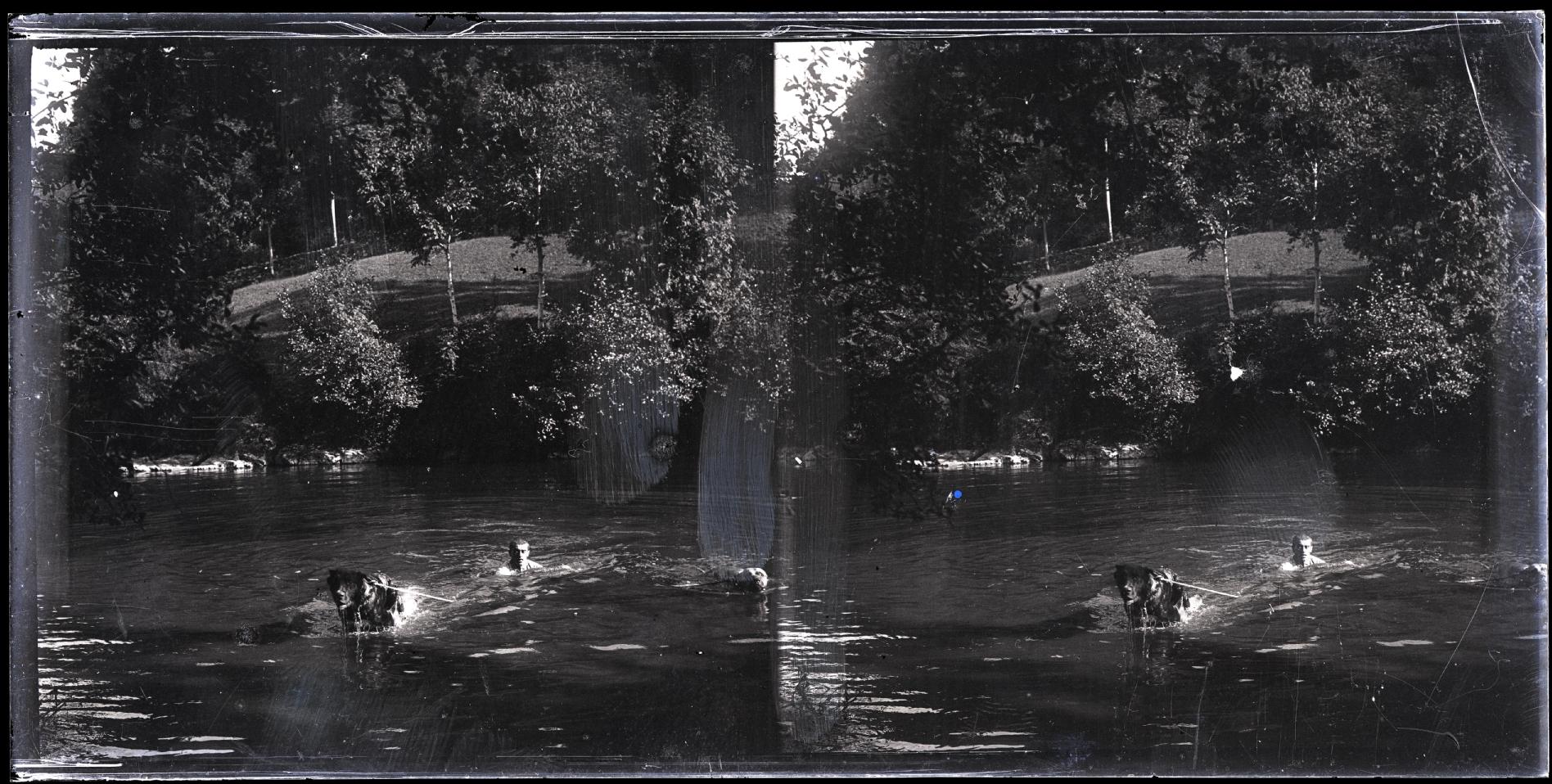 • Contenido: Escena de 2 perros y un hombre nadando hacia la orilla en el río Batzán junto al señorío de Bertiz en Oyeregui.