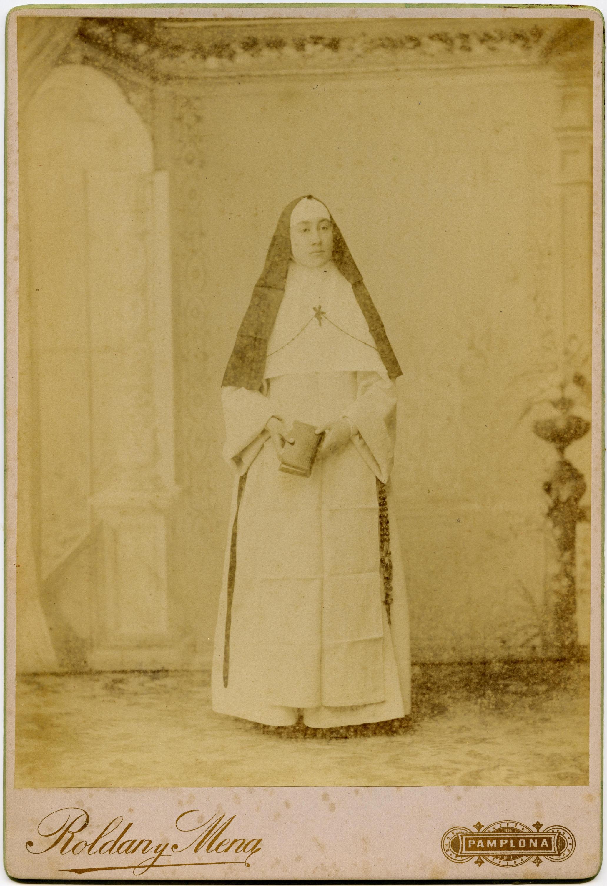• Contenido: Retrato en plano entero de una de las hijas del matrimonio formado por Martín Esteban Iraizoz Oyarzun y María Fermina Gastesi Erviti con hábito de las Reverendas Madres Dominicas ante un fondo con decoración arquitectónica.