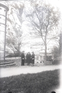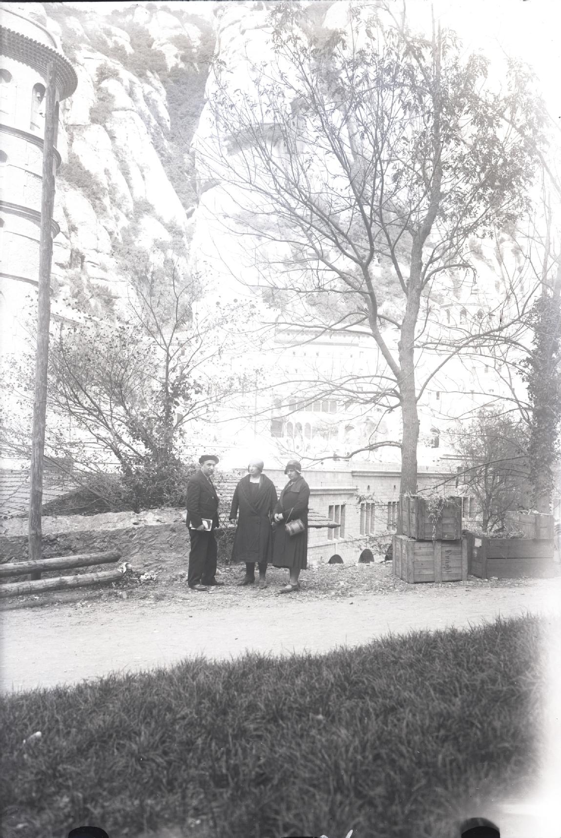 Retrato en plano entero de José Martínez Berasáin y Ramona Erro con una amiga en el monasterio de Montserrat. En primer término de izquierda a derecha, José, Ramona y una mujer, en la derecha unas cajas, en segundo plano árboles, detrás el edificio principal del monasterio y al fondo las montañas rocosas.