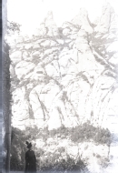 Retrato en plano americano de Ramona Erro, mujer de José Martínez Berasáin, en Montserrat. En primer término Ramona Erro, detrás las formaciones rocosas de las montañas de Monserrat.