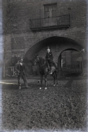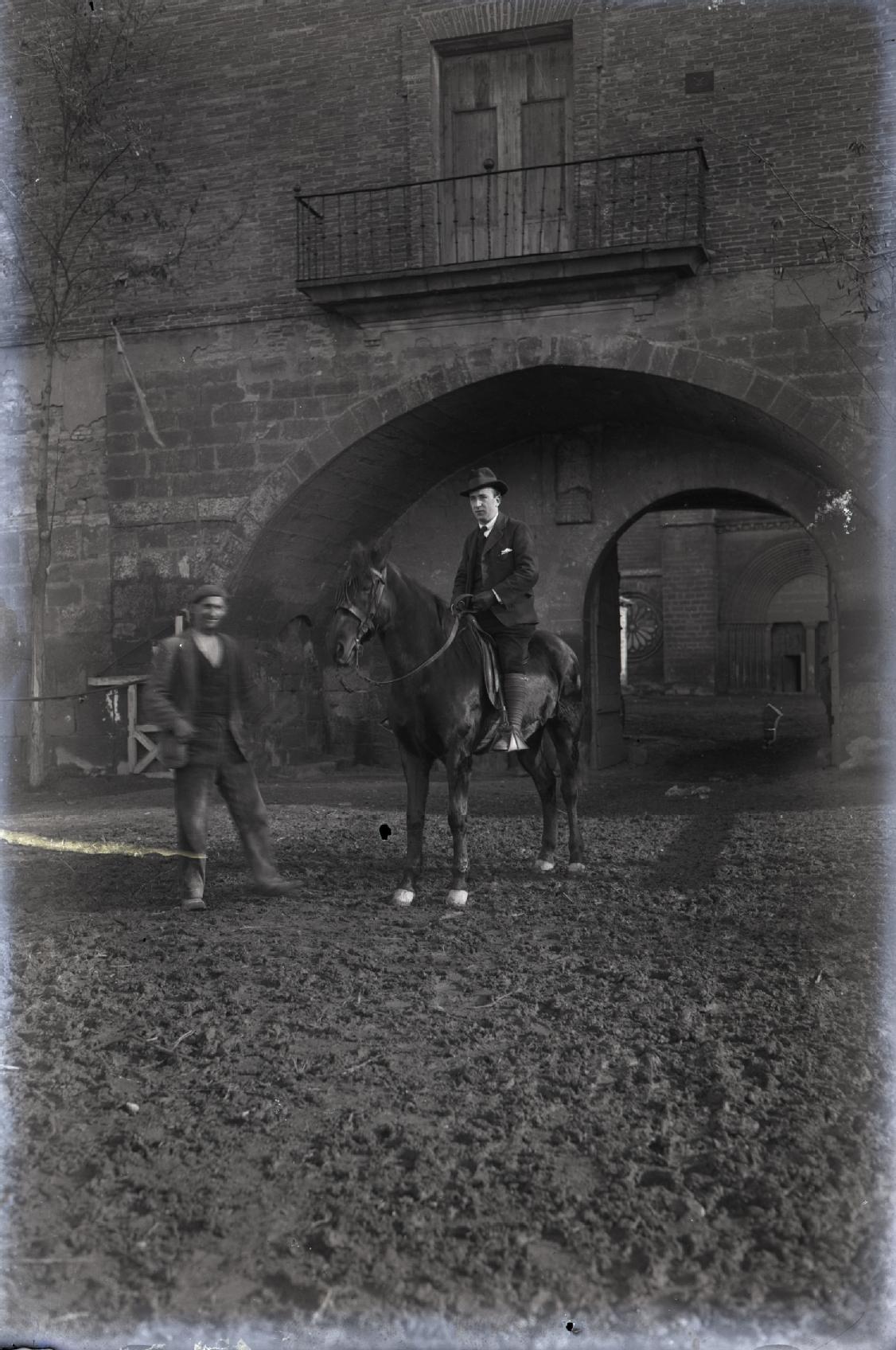 Retrato en plano entero de José Martínez Berasáin montado a caballo en la entrada del monasterio de La oLiva en carcastillo. En el centro del imagen José Martínez Berasán a caballo y a su derecha un hombre, de fondo la fachada y puerta de entrada al recinto monacal.