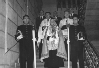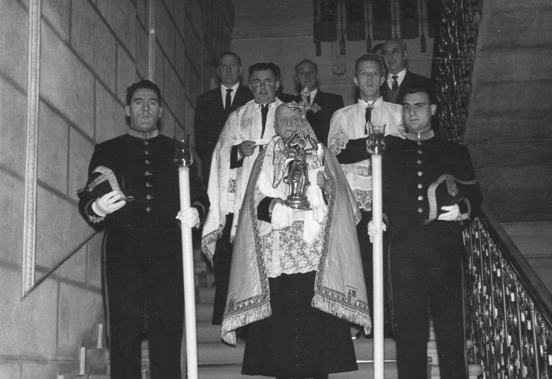 Vista general de la comitiva de la procesión celebrada en el Palacio de Navarra con motivo de la visita del Ángel de Aralar a la Diputación Foral, a su descenso por la escalera principal. En primer término, 2 ordenanzas con hachas. Tras ellos el capellán de la Diputación Foral, José Ardanaz, sosteniendo la efigie, seguido por 2 acólitos. Tras ellos el diputado foral José Heras Noáin; el vicepresidente Félix Huarte Goñi; y el secretario de la corporación, José Úriz Beriáin.