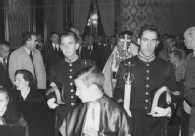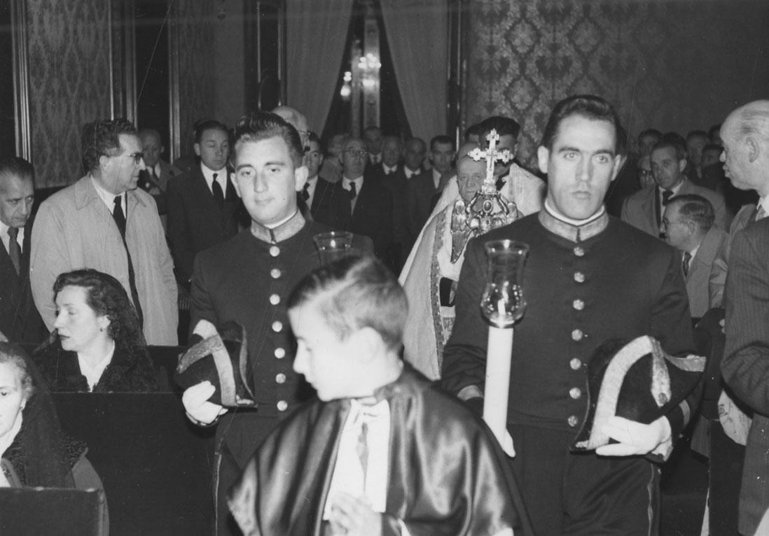 Vista parcial de la entrada en la capilla del Palacio de Navarra de la efigie del Ángel de Aralar y su comitiva con motivo de la visita anual dispensada a la Diputación Foral. En el centro, la comitiva integrada por 2 monaguillos; 2 ordenanzas uniformados con hachas; el capellán de la Diputación Foral, José Ardanaz, con la efigie; y un acólito. Tras ellos camina la corporación foral. A los lados, otros asistentes al acto sentados o en pie en los bancos de la capilla.