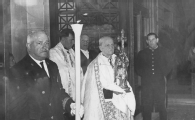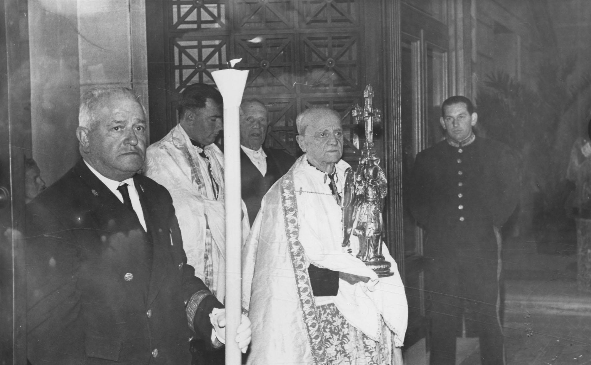 Vista parcial de la entrada del Ángel de Aralar en el Palacio de Navarra, en Pamplona, durante su visita anual a la Diputación Foral. En el centro, el capellán de la Diputación Foral, José Ardanaz, porta la efigie de San Miguel flanqueado por un ordenanza con un hacha y un acólito. Tras ellos, un ujier uniformado en el zaguán del edificio.
