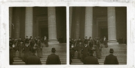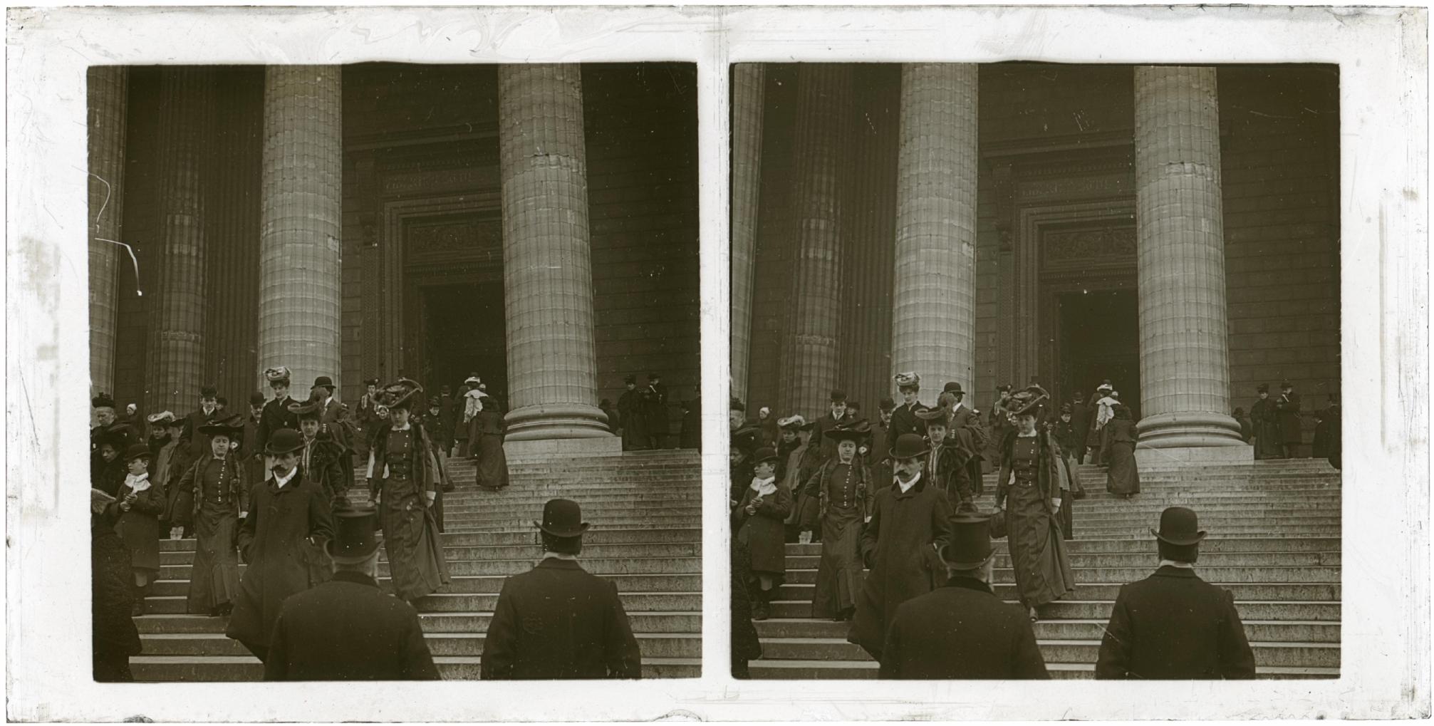 Vista de la escalinata de acceso a la iglesia de la Madeleine de París con numerosas personas descendiendo. En primer término, las escaleras con mujeres y hombres. En segundo plano, las columnas y, al fondo, la portada.
