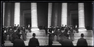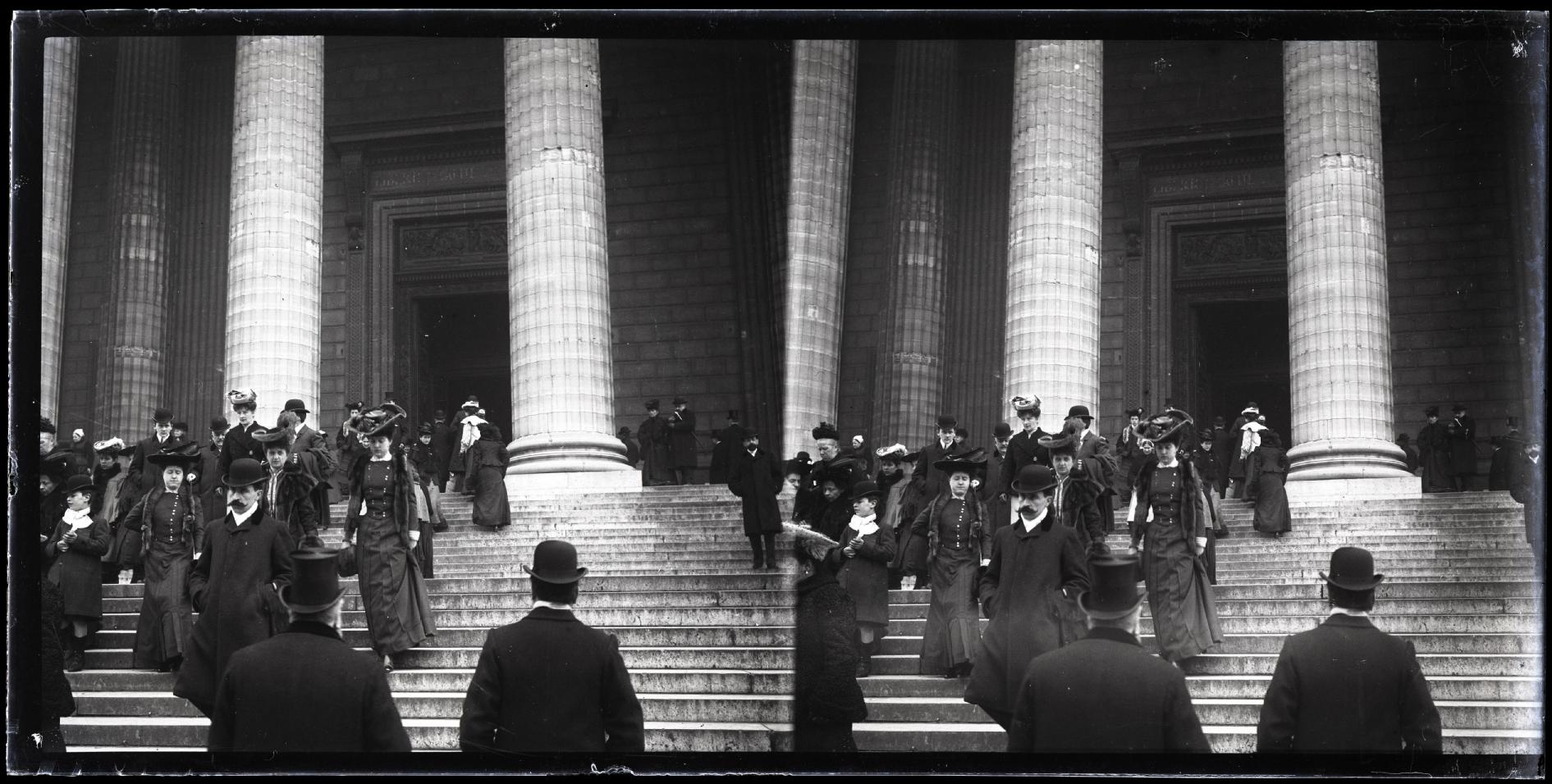 • Contenido: Vista de la escalinata de acceso a la iglesia de la Madeleine de París con numerosas personas descendiendo. En primer término, las escaleras con mujeres y hombres. En segundo plano, las columnas y, al fondo, la portada.